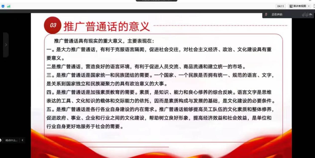 为提高师生的参与,公司号召全体师生通过举办推普周晨读活动、主题班会、抄报评比等多种形式的活动开展线上学习推广,进行推普周活动宣讲,引导员工积极参与普通话学习,树立普通话推广意识。