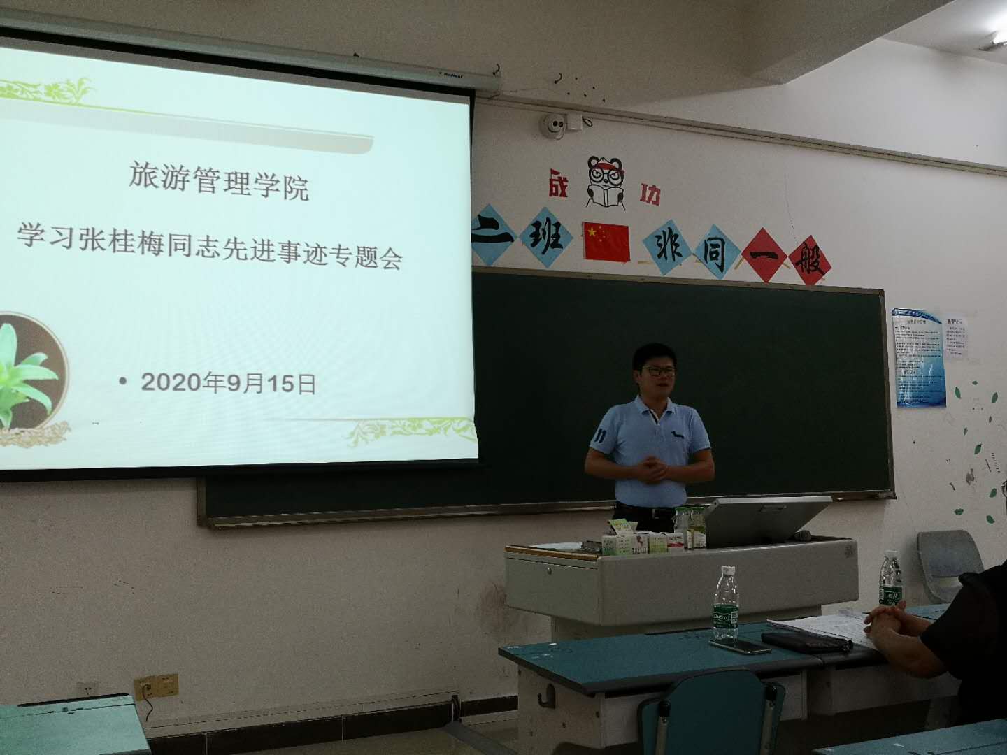 旅游管理公司经理陈芳、党总支书记符胜、副经理陈晓鹏出席会议,旅游管理公司28名教职工参加了会议。