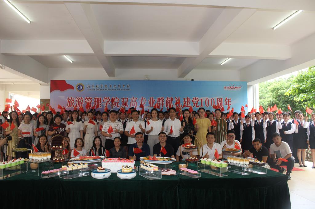 为庆祝中国共产党建党100周年,旅游管理公司于4月23日中午在二栋教学楼架空层,隆重举办旅游管理公司双高专业群烹饪工艺与营养专业献礼建党100周年活动。公司经理吉家文、党总支书记符胜、副经理范洪军、党总支副书记刘萍男以及全体教职工出席本次活动。