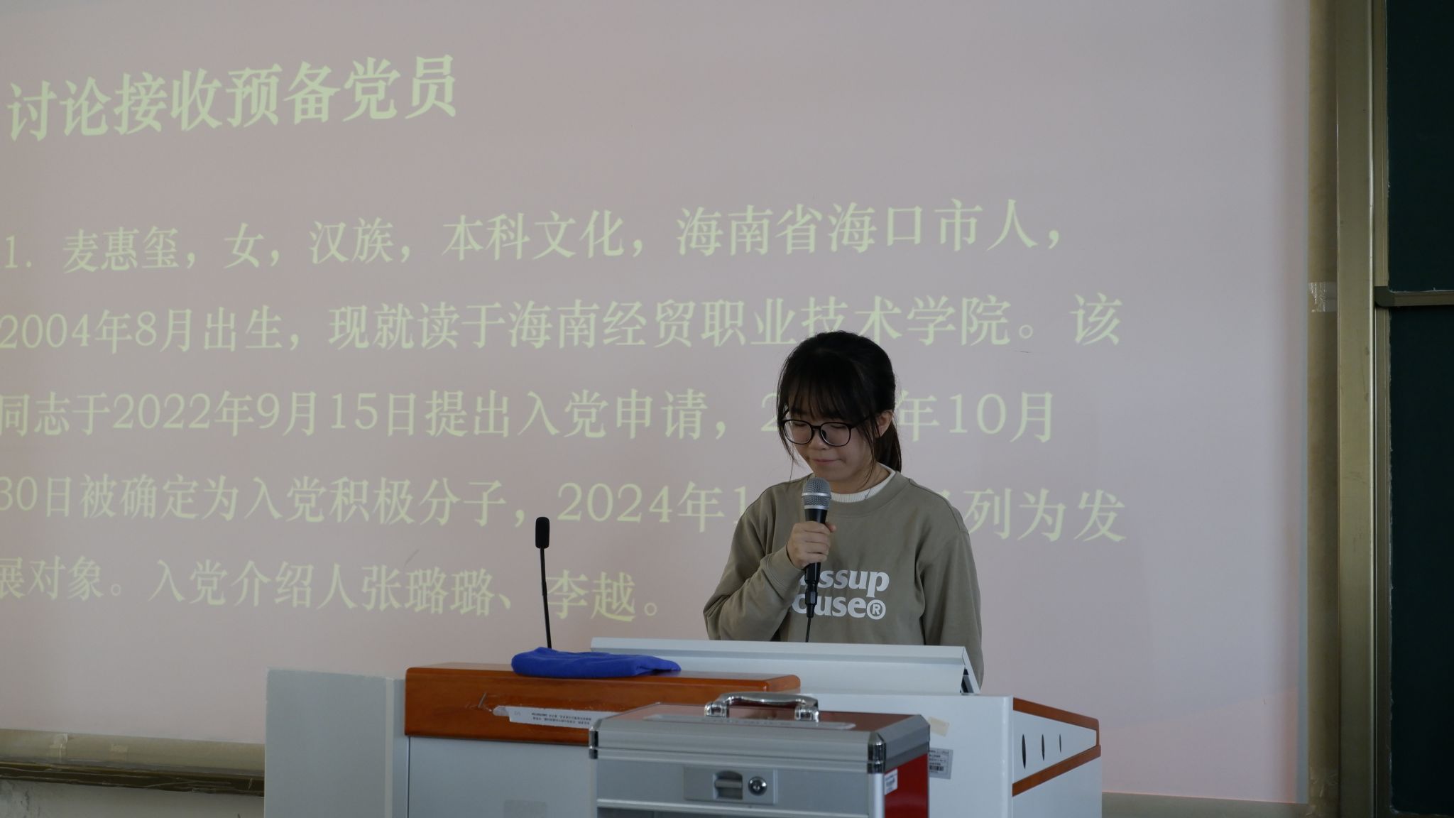 随后,积极分子王川岛、麦惠玺依次就自身在考察期内的生活、工作、思想及学习情况进行汇报。他们既肯定了自己近期在各方面所取得的进步,又坦诚地指出了自身存在的不足之处,与此同时,还表明了自己加入党组织的坚定信念与决心,明确了今后努力方向。