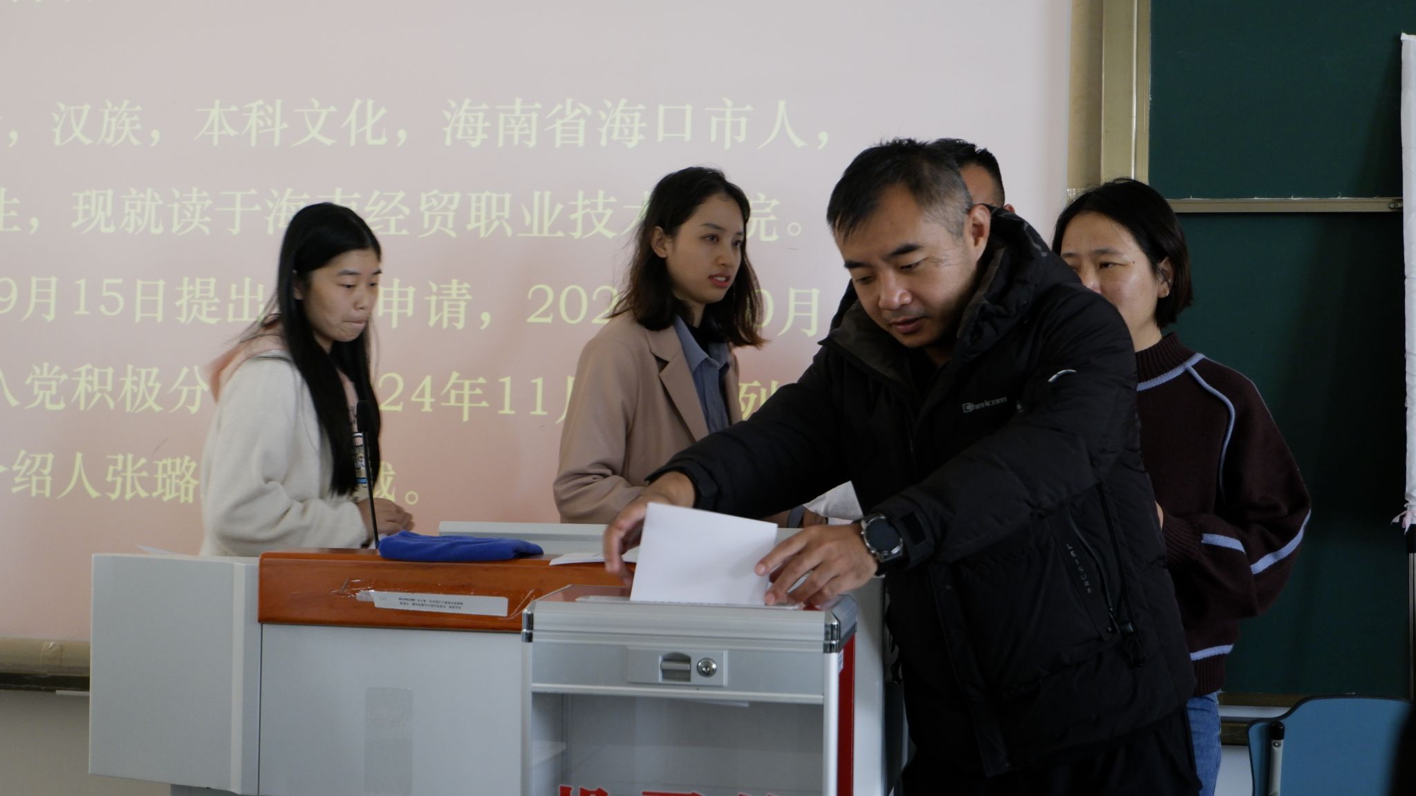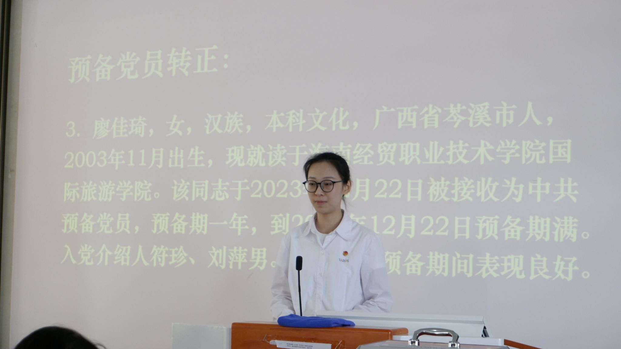 李越介绍本次会议议程后,宣布到会人数符合党支部预备党员转正要求。会议严格按照党员发展程序进行,六位预备党员汇报自己在预备期间的学习情况、思想动态、工作表现等,正式向党支部提出转正申请。他们在汇报过程中,客观评价自身情况,并表示要坚持理论与实践相结合的原则,加强党性修养,努力做好本职工作,尽职尽责服务同学,表明自己加入中国共产党的坚定决心。