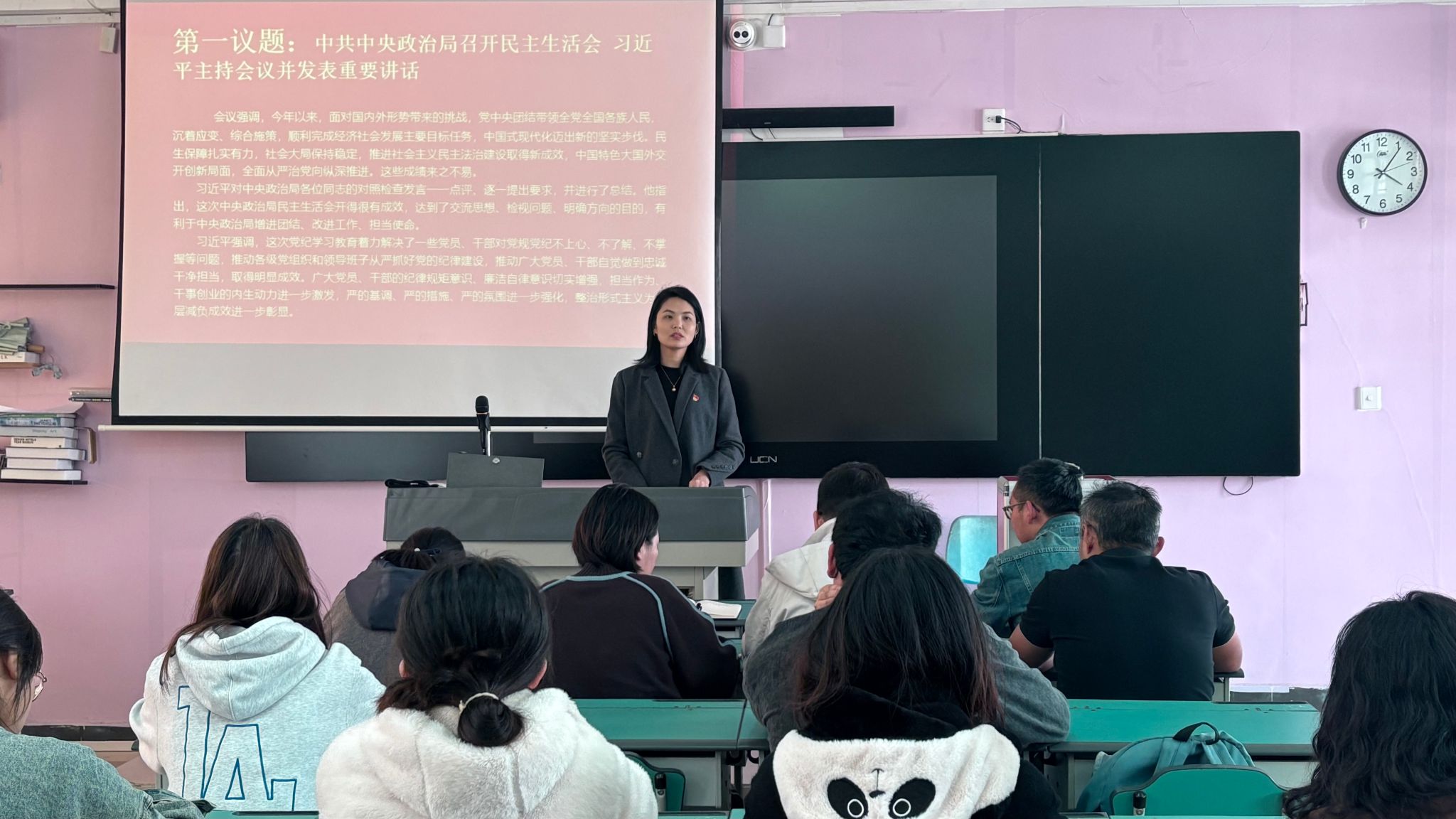 会前,党总支副书记刘萍男传达学习了习近平总书记在中共中央政治局民主生活会上的重要讲话精神。并提出,要带头学习党的创新理论和党章党规党纪,坚持把政治修养摆在党性修养的首位;要更加严格要求自己,敬畏纪律、遵守纪律,劝诫家人亲属和身边同学朋友,做清正廉洁的表率。