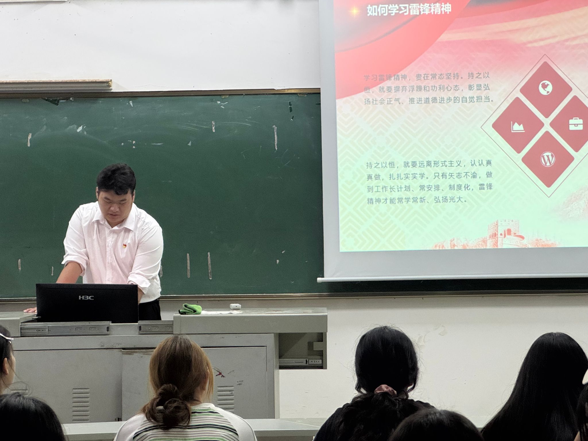 王川岛向大家介绍了雷锋同志的事迹及其所蕴含的精神内涵,并强调了雷锋同志的高尚品德和崇高精神对于当代青年的全面发展具有重大的时代价值;麦惠玺向同学们介绍了身边的雷锋精神,在摩羯台风肆虐后,有一群同学就地化身“活雷锋”,自发投身校园灾后重建工作;王小蕾分享了雷锋日记中“捐钱”和“一颗螺丝钉”的故事,这两个故事充分体现了雷锋同志爱国爱党、服务人民、爱岗敬业的可敬精神,希望大家都能学习雷锋精神,弘扬奉献、友爱、互助、进步的志愿精神,践行社会主义核心价值观,为他人送温暖、为社会做贡献。