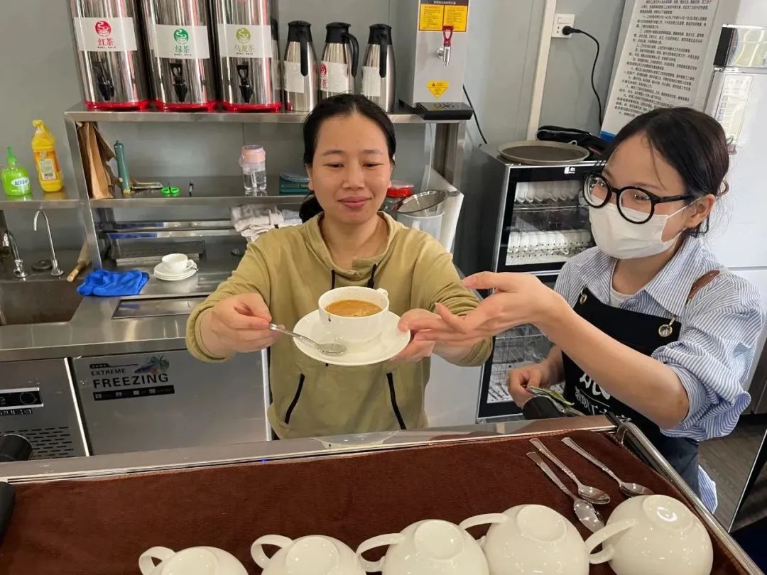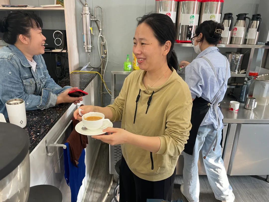 活动中,员工“咖啡师”为女教职工泡咖啡,品味手冲咖啡纯粹的浓香。大家手捧咖啡,细细品尝,感受丰厚的质感与独特的柔软口感,留下无穷回味。