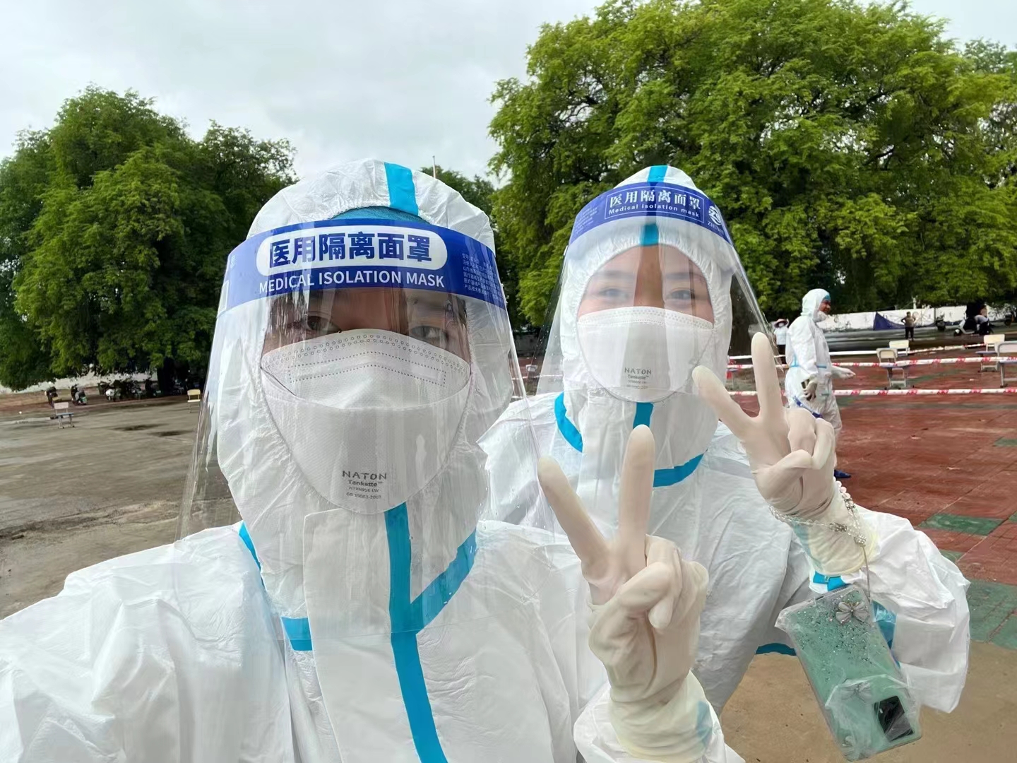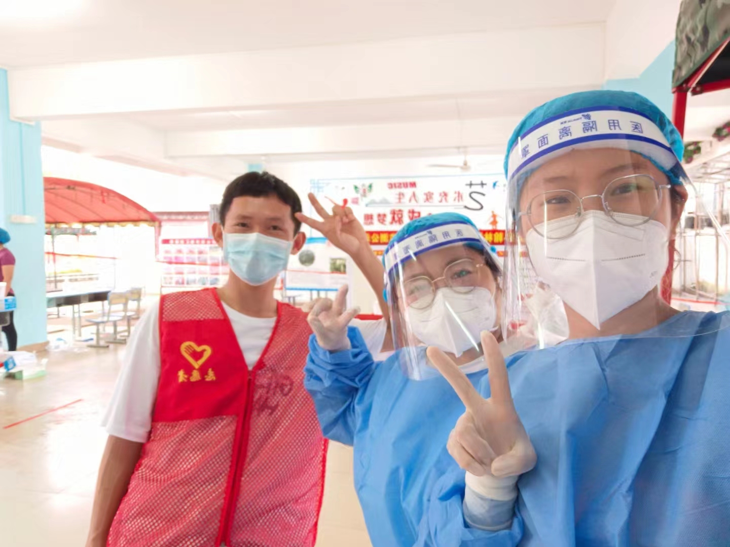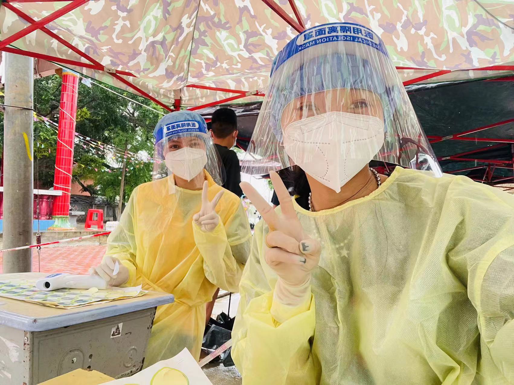 ▲21级旅游管理本科二班陈华杏在儋州市白马井镇当志愿者协助核酸检验