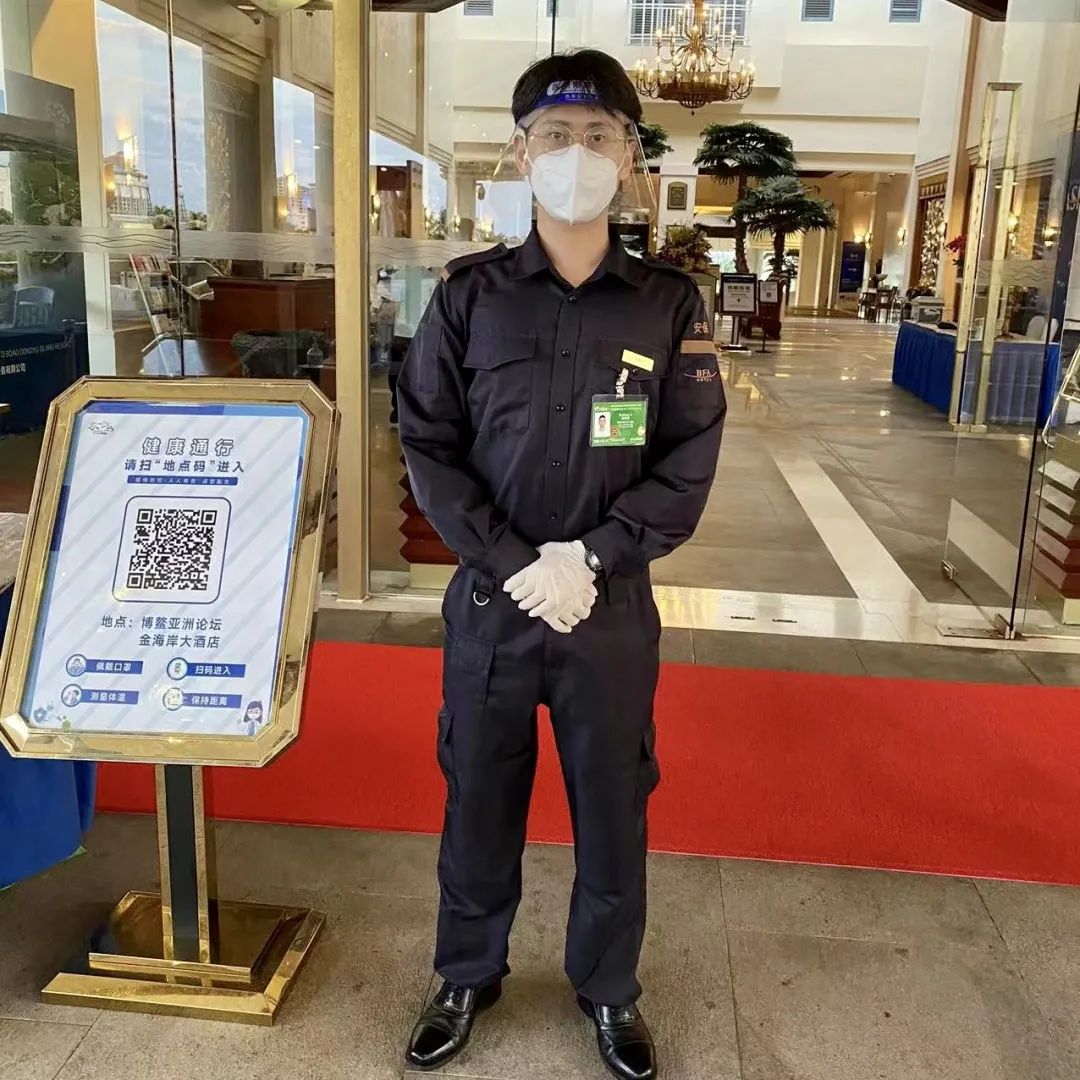 21级旅游管理本科1班的李博东,是博鳌金海岸酒店安保部门的一名志愿者。