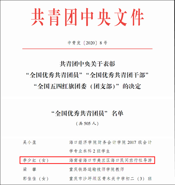 为表彰先进,宣传先进,激励全国团员、团干部和各级团组织奋发有为、再创佳绩,共青团中央近日决定,授予505名同志“全国优秀共青团员”称号。365官网体育旅游管理公司优秀员工李少虹名列其中。