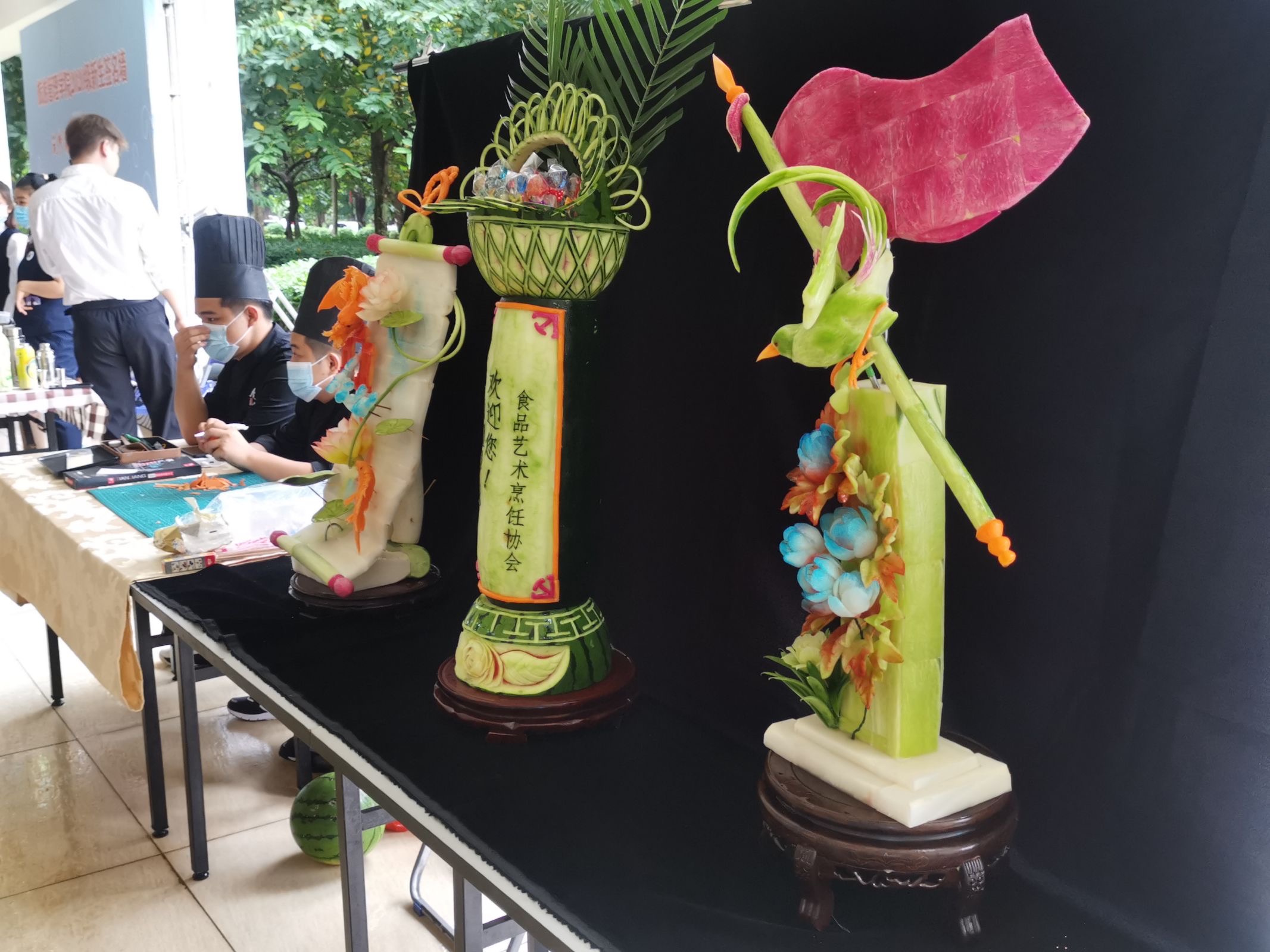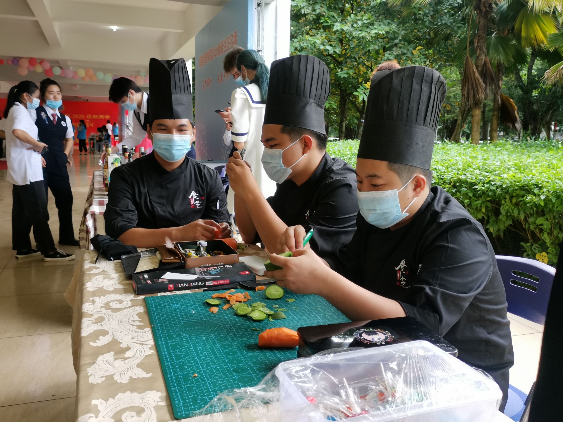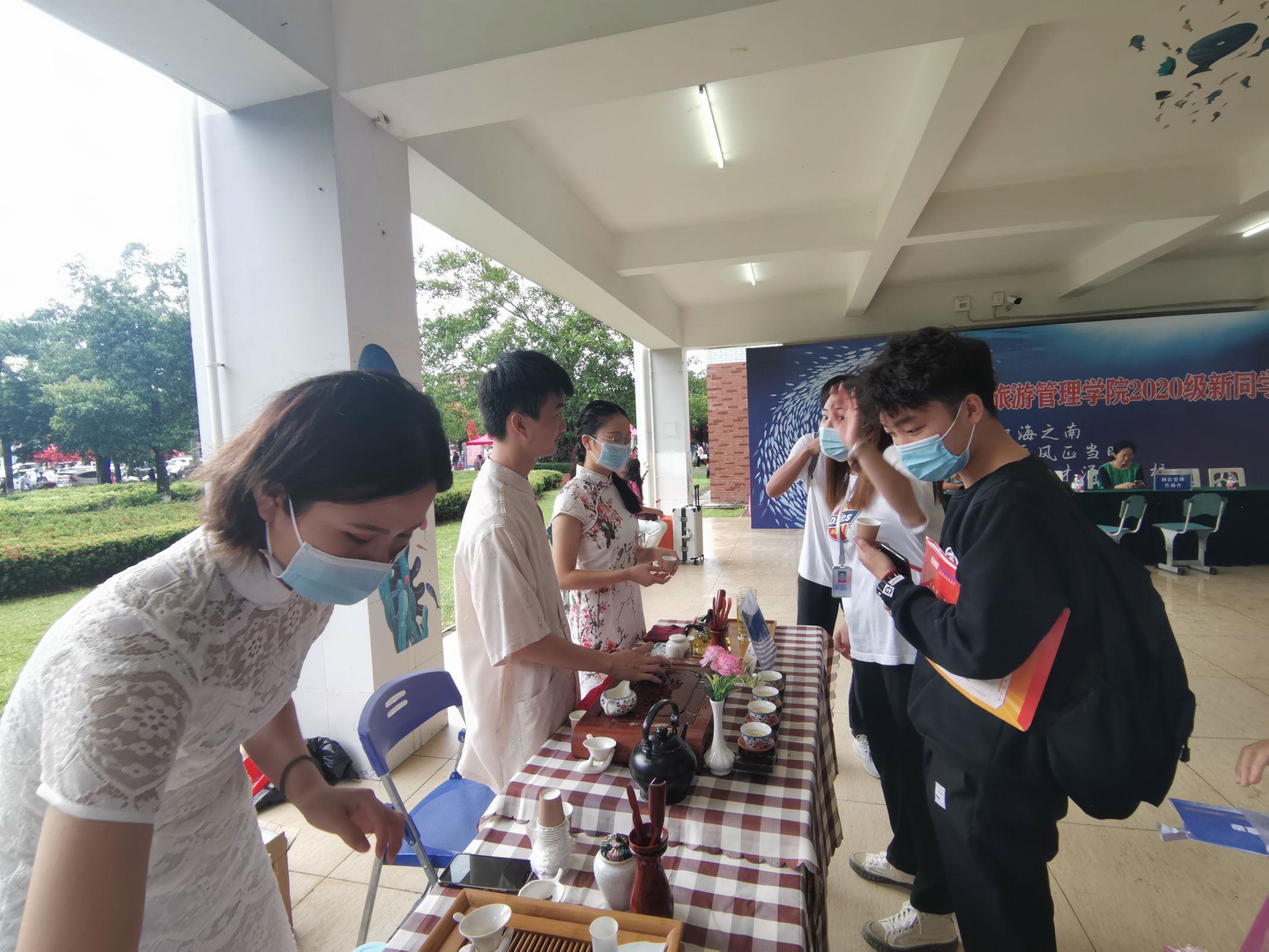 2020年10月15日-10月16日公司于二栋教学楼下开展了迎新工作。迎新大本营根据旅游管理公司专业特色设置了茶艺表演区、调酒表演区、食品雕刻展示区。此外公司食品艺术烹饪协会还为每一位员工及家长准备了精心制作的曲奇饼干。