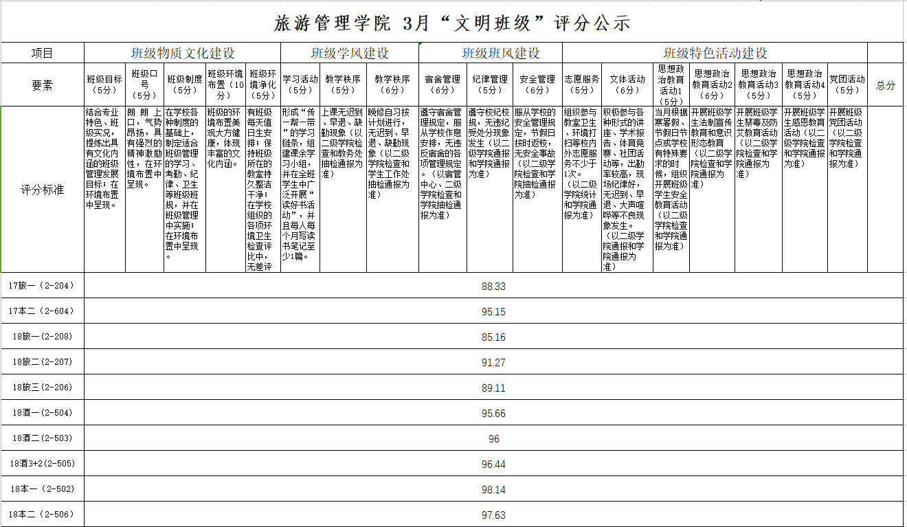 为响应公司“1689”校园文明大行动要求,公司决定以“凝练班风为核心,增强班集体的向心力和归属感”为主题,要求每班以打造“紧密团结、关系和谐、积极向上、富有特色”的班级文化,营造和谐、友好、积极、向上的班级文化氛围,结合公司实际,公司特制定于3月22日下午4;00公司相关领导携员工会相关人员进行文明班级评比工作,现对公司3.22的文明班级评比作出以下公布。