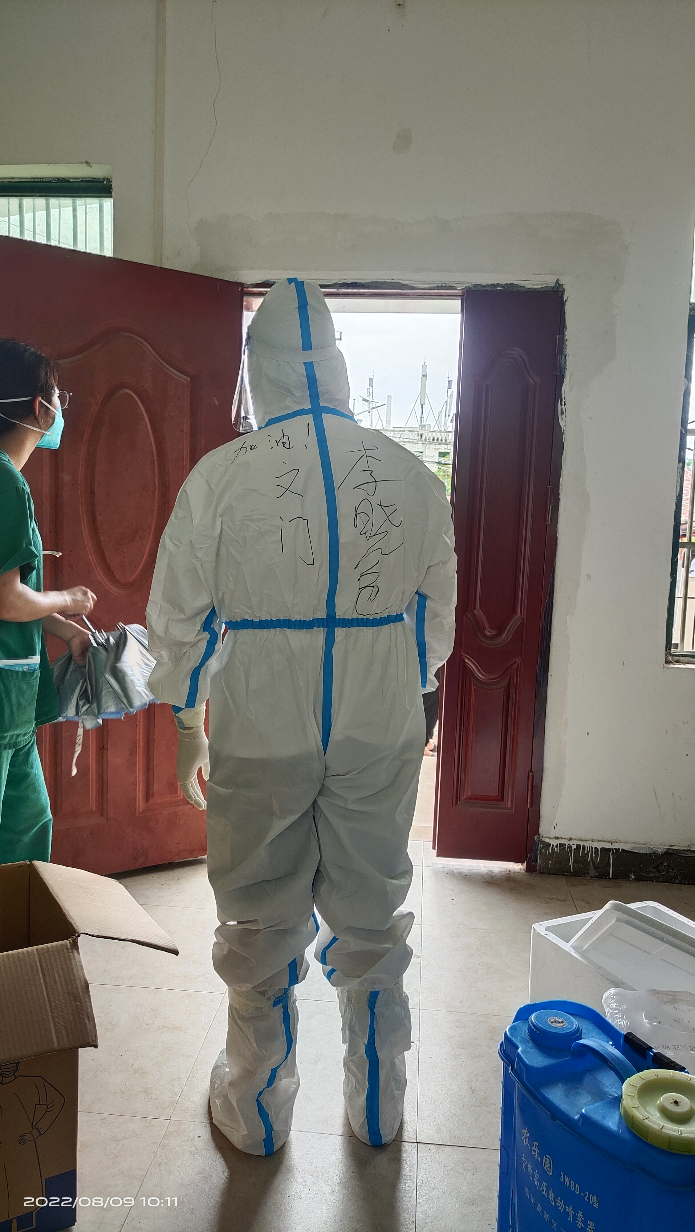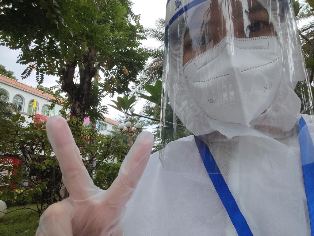8月5号的凌晨,他乘车前往20多公里外的三亚市实验小学区域展开志愿者服务,负责信息采集和核酸采样工作。第一次穿上防护服时,他说:“感觉一股热气从下往上冲,最后热气将全身包裹的时候,我才明白了一线工作者是多么的不容易。”8月10日晚十点,刚吃完晚饭的他,在向辅导员报备了近期行程后,顶着夜色再一次踏上了上门核酸采样的路。