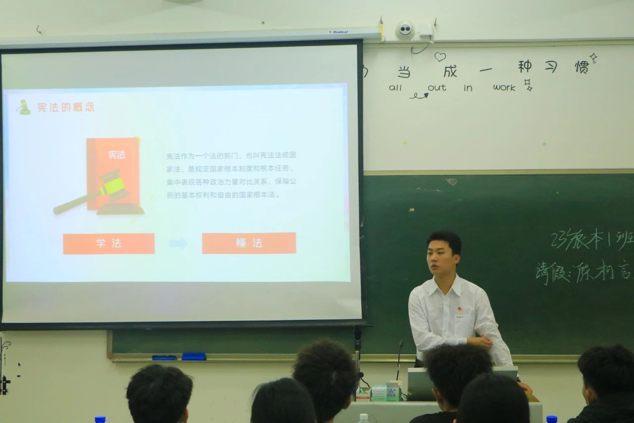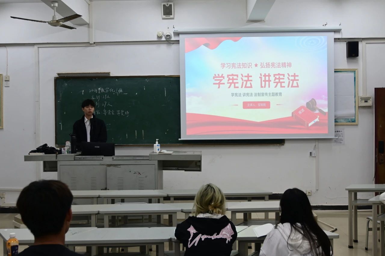 2023年12月4日是第十个国家宪法日,为全面践行社会主义核心价值观,认真学习贯彻党的二十大精神,增强员工的法治观念,提高员工的法治意识,beats365官方唯一入口开展了以“学习宪法知识,弘扬宪法精神”为主题的国家宪法日宣传活动。当天,beats365官方唯一入口员工会主席团成员赵路、王金叶、邱天菊、宝展鹏、刘孜莹五位同学,以及退伍军人齐正文共同前往各个新生班级进行宪法宣讲。