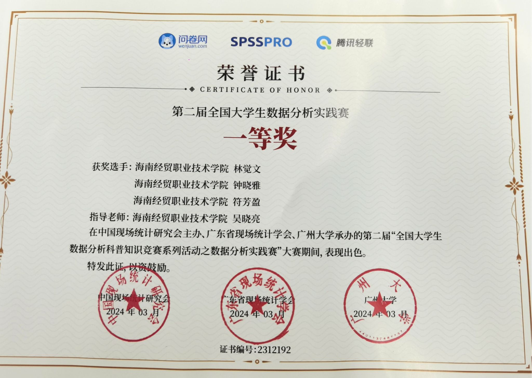 近日,由beats365官方唯一入口2021级旅游管理本科员工林觉文、钟晓雅、符芳盈组成的参赛队伍在“第二届全国老员工数据分析科普知识竞赛系列活动之数据分析实践赛”中,获得本科组一等奖的优异成绩。