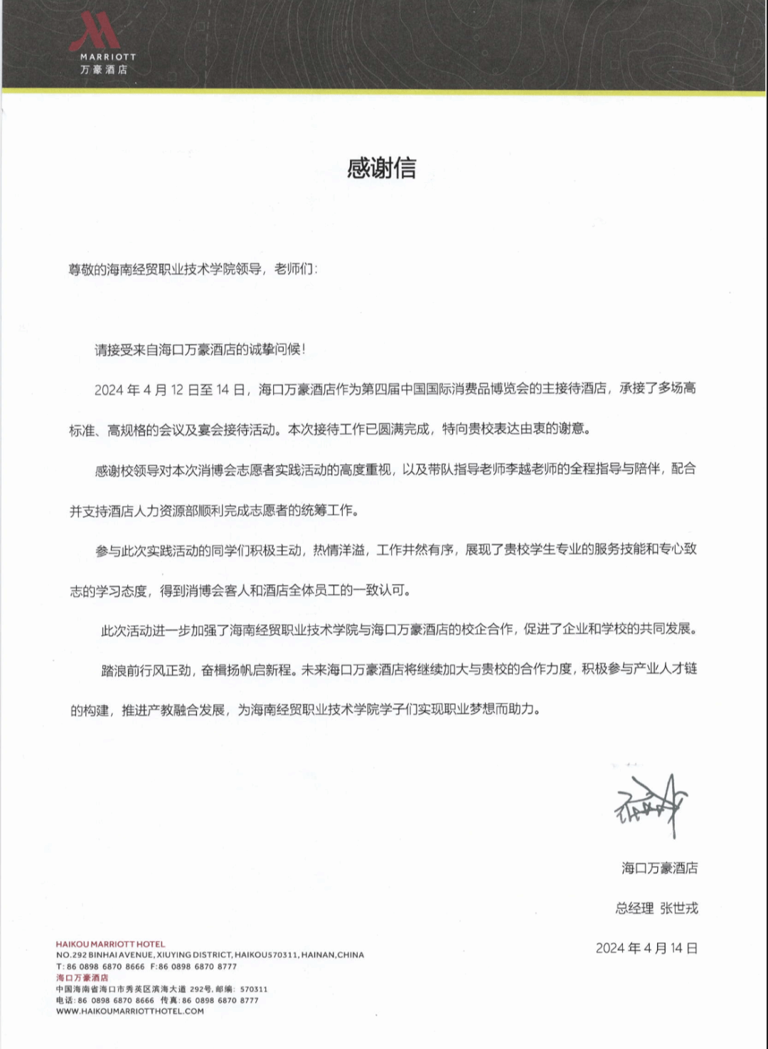 海口万豪酒店对beats365官方唯一入口的领导和带队指导老师李越的全程指导与陪伴表示衷心感谢,并对公司在志愿者实践活动中的高度重视和支持表示敬意。
