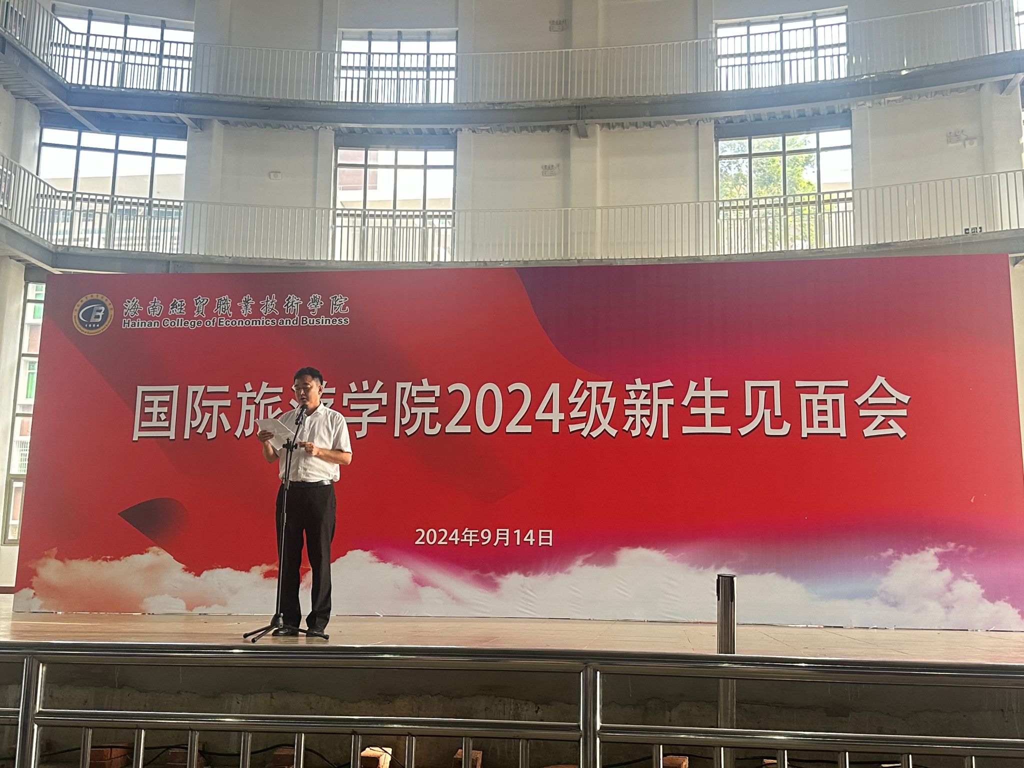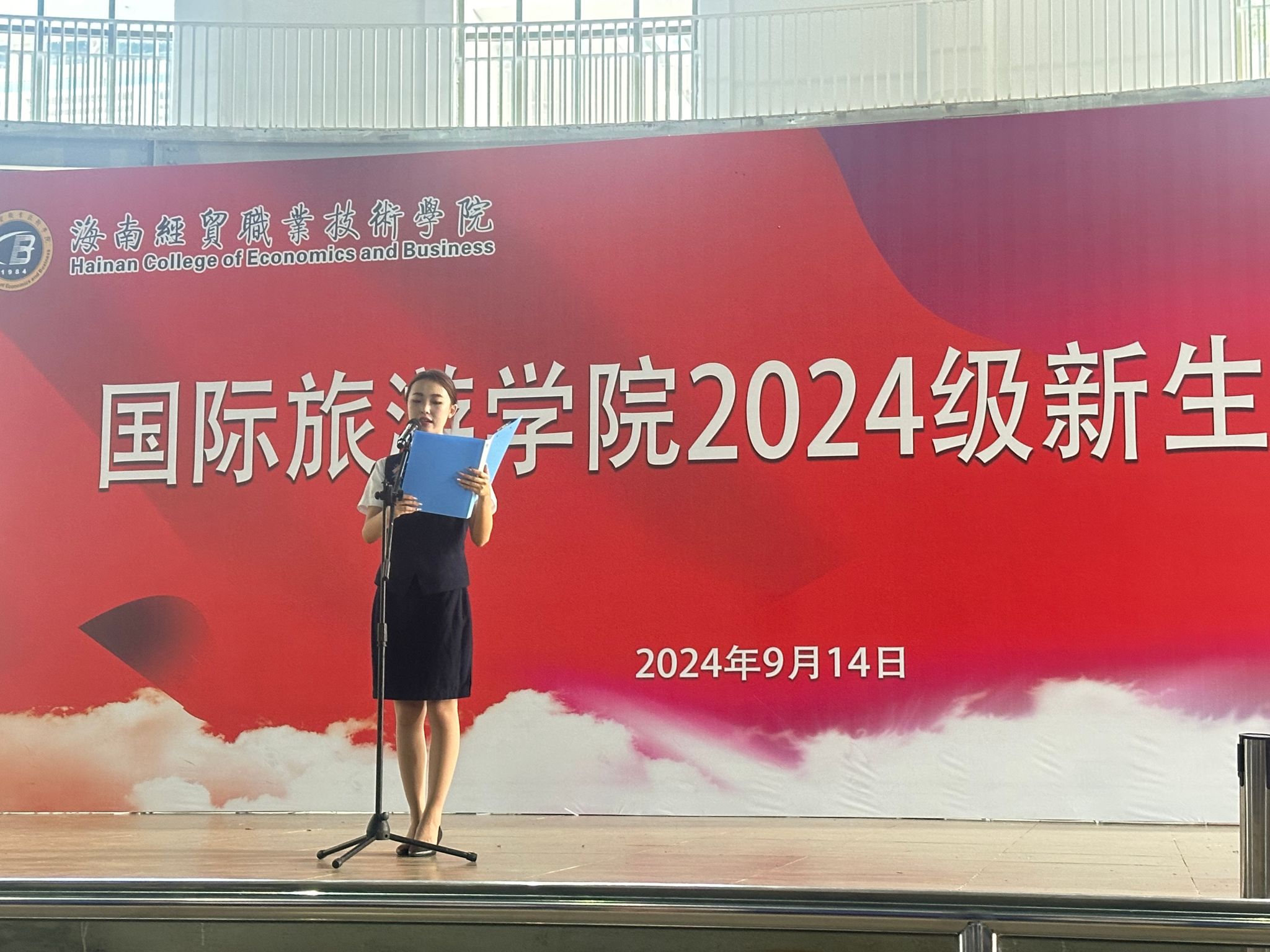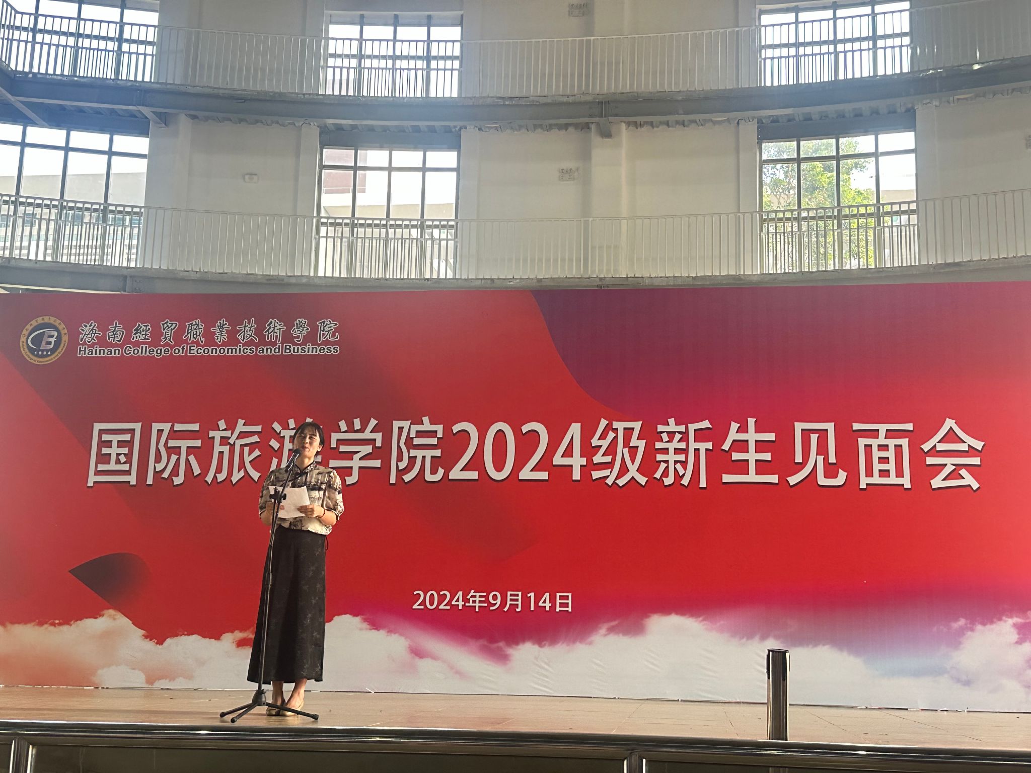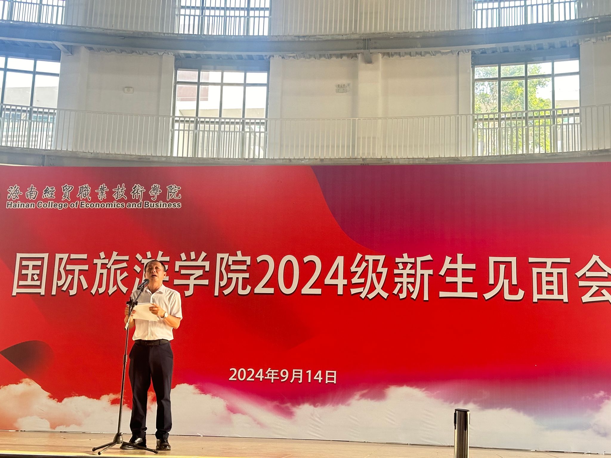 随后,老生代表、新生代表和教师代表分别上台发言。老生代表葛源寄语:“大学要注重身份的转变,需要我们学会独立思考、自主学习,要学会与人沟通、合作共事”,她希望师弟师妹们能够永远保持一颗好奇心,勇于探索,敢于追梦。新生代表李祎结合自己专升本的经历说:“正是因为海经贸给我提供了一个广阔的学习和成长平台,让我遇见更好的自己,才会一次又一次的选择经贸和国旅,再续美好的缘分”。她表示,期待在未来和各位同学一起与国旅携手并进,共同创造更精彩的未来。