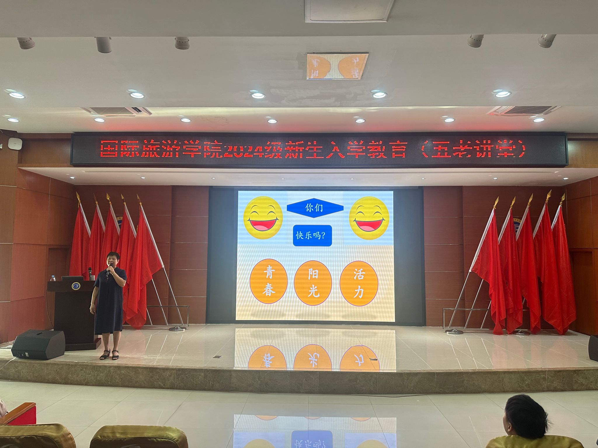 黄老师以其丰富的阅历和深刻的见解,从多个角度阐述了如何在老员工活中保持快乐的心态、树立自信的品质以及追求成功的路径。她强调了快乐生活的重要性,鼓励新生们要学会在忙碌的学习与生活中寻找乐趣,培养积极向上的心态,以乐观的态度面对挑战与困难。接着,黄老师深入探讨了自信做人的内涵。她指出,自信是成功的基石,是每个人在成长道路上不可或缺的品质。她鼓励新生们要相信自己的能力和潜力,勇于尝试新事物,敢于面对失败与挫折,并从中汲取经验和教训,不断提升自我。在谈到成功时,黄老师强调了成功并非遥不可及,而是蕴藏在每个人的日常努力与坚持之中。她分享了多个成功人士的故事和案例,让新生们深刻认识到成功需要付出辛勤的汗水和不懈的努力。同时,她也提醒新生们要树立正确的成功观,不要盲目追求名利和地位,而是要关注内心的成长与提升,追求真正属于自己的幸福与成功。