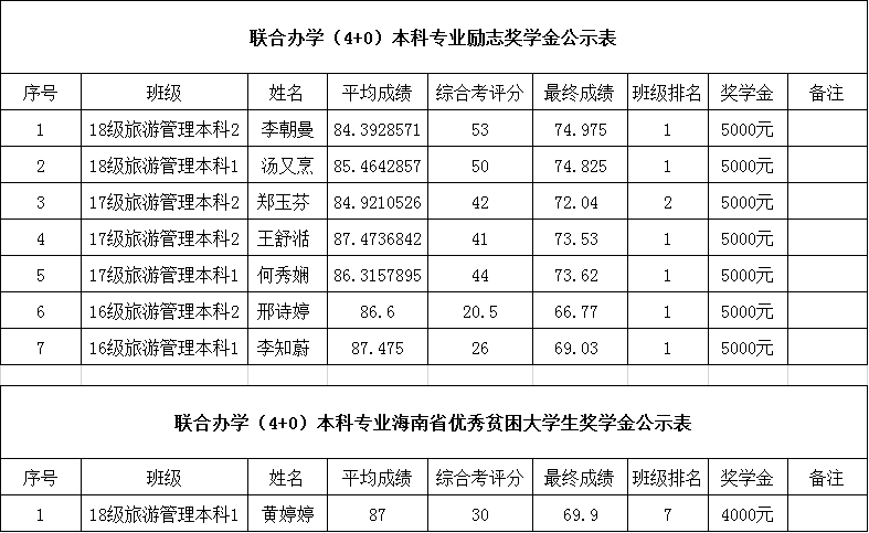 为促进公司员工全面发展,鼓励员工刻苦学习,奋发向上,促进校风学风建设,公司根据《365官网体育“国家励志奖学金”管理实施细则》(2019版)、《365官网体育“国家助学金”管理实施细则》(2019版)及《365官网体育“海南省优秀贫困老员工奖学金”管理实施细则》(2019版)评定办法,本着公平、公正、公开、民主的原则,选出2018—2019学年度励志、省奖学金名单,现进行公示,如对以下评选结果有异议者,请与旅游管理公司学工办老师反映。