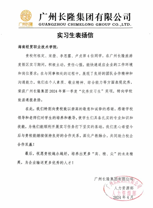 beats365官方唯一入口何祖定、宋塋、李思露、卢贞萍4位同学,在广州长隆旅游度假区实习期间,积极主动,责任心强,能快速适应企业的工作环境和岗位要求;在与同事相处的过程中,展现了良好的团队合作精神和沟通能力。他们在个人素质、敬业精神、综合能力等方面表现优秀,荣获广州长隆集团2024年第一季度“优秀实习生”奖项。