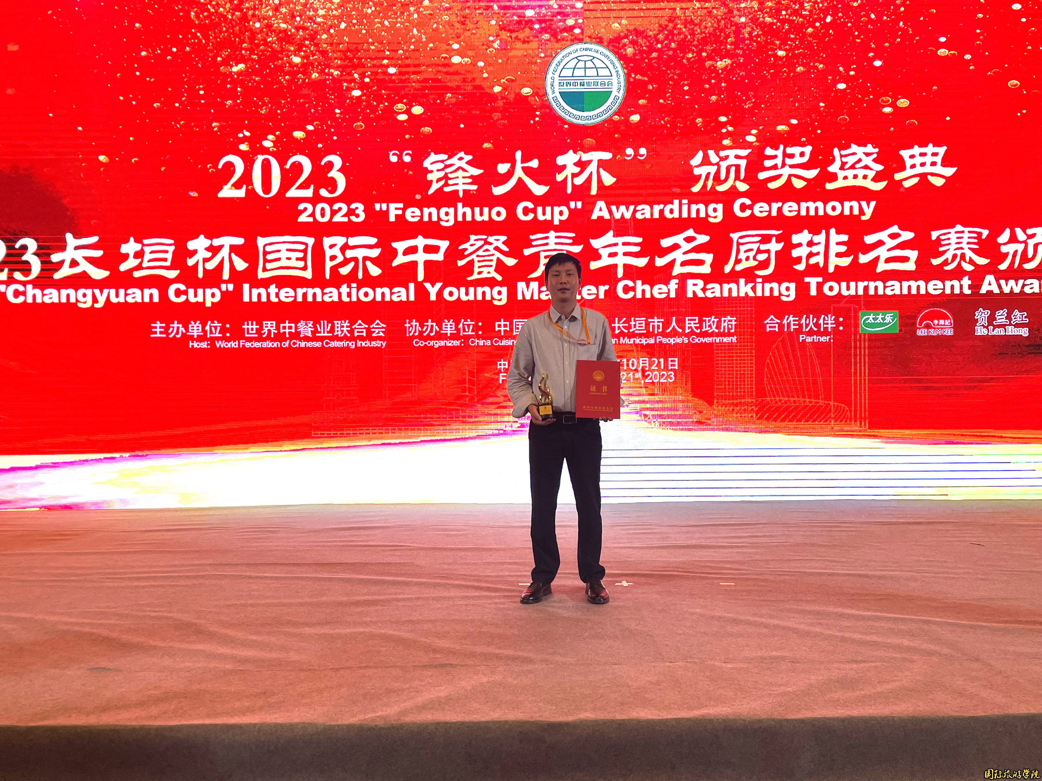 2023“锋火杯”评选旨在表彰面向全球范围内,为推动中餐业发展、弘扬中餐文化、提高中餐烹饪技艺以及在中餐行业的教育、培训、服务、文化传播、等方面树立行业标杆、作出突出贡献的组织、企业和个人。为做好本次表彰参评工作,陈伟君老师积极准备申报材料,以扎实的专业技能和丰富的材料,认真和组委会对接,最终获得世界中餐业联合会颁发的“2023中餐青年厨师菁英”奖。