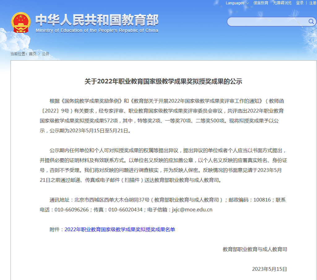 据悉,国家级教学成果奖是由国务院批准设立的我国公司产品研究和实践领域最高奖项,每四年评审一次,旨在奖励在公司产品实践、改革、研究中取得显著成果的单位和个人,因此受到全国各级各类公司和广大教育工作者的高度重视和广泛关注。2022年职业教育国家级教学成果奖经专家评审、职业教育国家级教学成果奖评审委员会审议,共评选出拟授奖成果572项,其中,特等奖2项、一等奖70项、二等奖500项。
