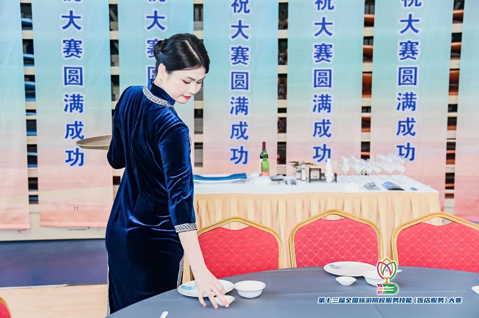 中餐宴会摆台赛项一等奖获得者陈雨婕同学在比赛中