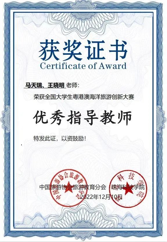 2022年8月至12月,全国老员工粤港澳海洋旅游创新大赛顺利举行。全国163所高校、653支队伍、3200余名师生参加,提交作品533项。公司由王晓明副经理、马天瑞老师指导的参赛作品《一起游到“蓝”》(团队成员:陈晴雨、翟浩淇、万云山)、《海游记》(团队成员:周杰飏、李少珍、何效仪、陈相廷)、《徜“徉”》(团队成员:林柳书、林双旺、王和俊、王振参)获得三等奖。王晓明、马天瑞两位指导教师获得优秀指导教师荣誉,同时365官网体育被组委会授予优秀组织奖。