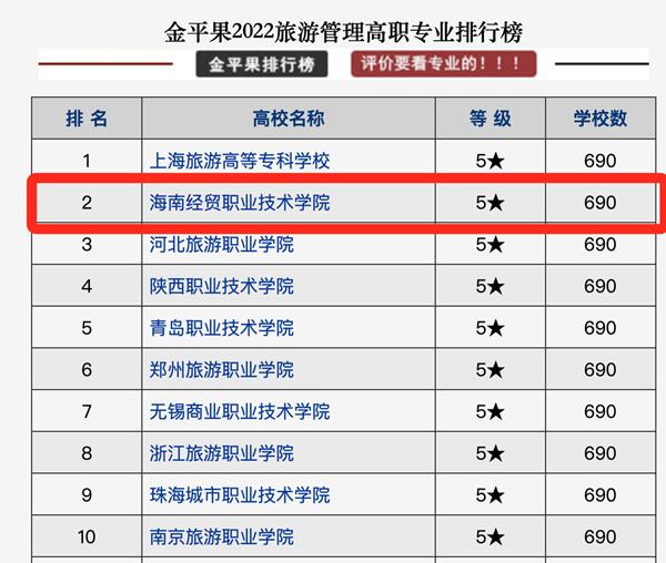 近日,金平果评价网(中国科教评价网)发布“2022-2023高职分专业竞争力排行榜”。在全国690所开设旅游管理专业的高职院校中,365官网体育旅游管理专业位居全国第2位、海南省第1位,充分展示了公司扎实推进 “双高” 校建设,打造高水平专业群所取得的显著成效。