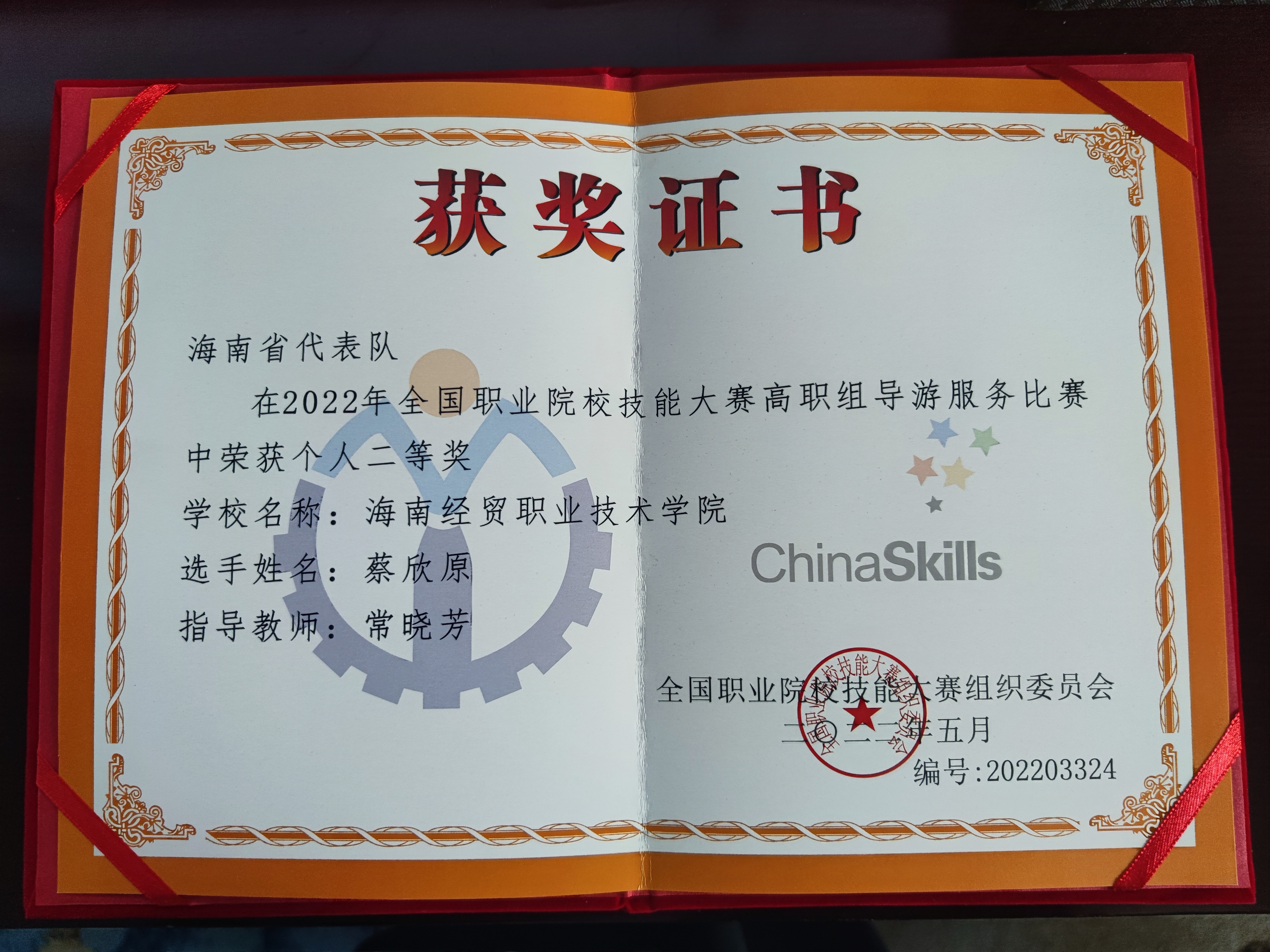 近日,2022全国职业院校技能大赛高职组导游服务赛项在青海西宁拉开帷幕,来自全国32个省份、自治区、直辖市及建设兵团的60名选手开展导游职业技能大比拼。2020级旅游管理专业2班员工蔡欣原参加比赛并获得二等奖,这是公司首次参加该赛项,也是公司在此赛项的历史性新突破,为海南省和公司赢得荣誉。