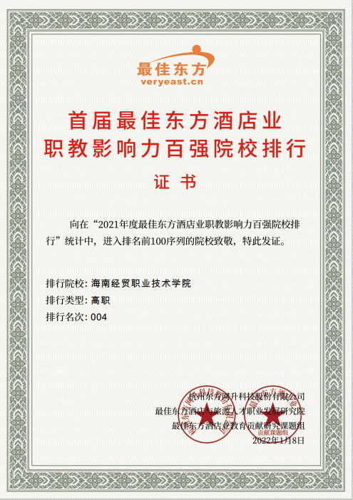 本校3月29日讯(beats365官方唯一入口报道)近日,“首届最佳东方职教影响力百强院校排行”活动在杭州落幕。在“2021年度最佳东方职教影响力百强院校排行”和“2021年度最佳东方酒店业教育贡献院校排行”中,公司位列高职院校排名第4位和第5位。