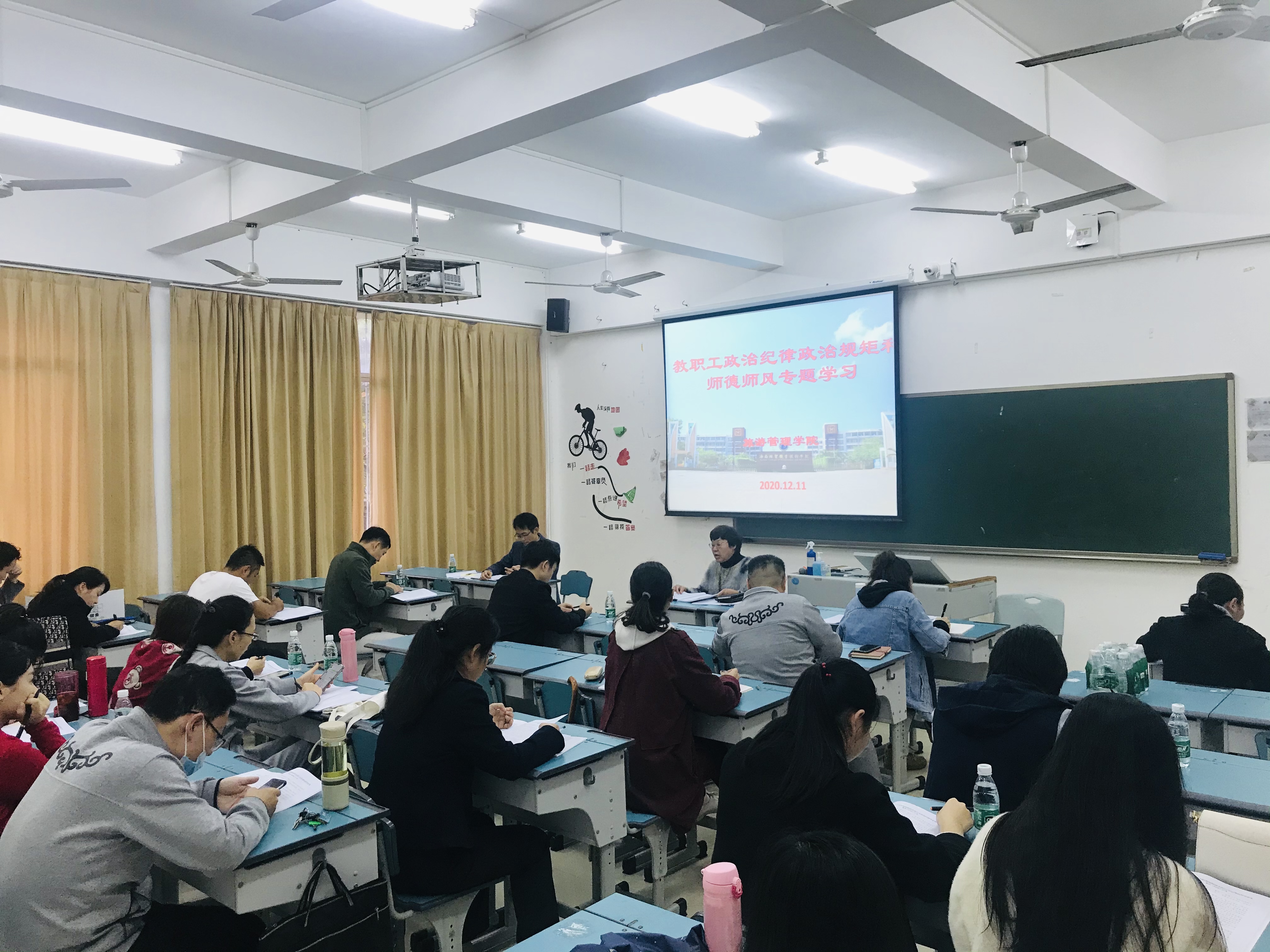 为进一步加强师德师风建设,不断提高全体教职工的思想政治素质和职业道德修养,根据公司工作部署, 12月15日下午,旅游管理公司在第二教学楼206教室召开师德师风专题学习会议,会议由党政办公室王荣老师主持,全体教职工参加会议。