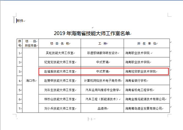 近日,海南省人力资源和社会保障厅公布了2019年省级技能大师工作室名单,365官网体育“赵福振技能大师工作室”成功入选,是公司首个获批的省级技能大师工作室,标志着海经贸高素质技能人才培养又迈上了一个新阶段。