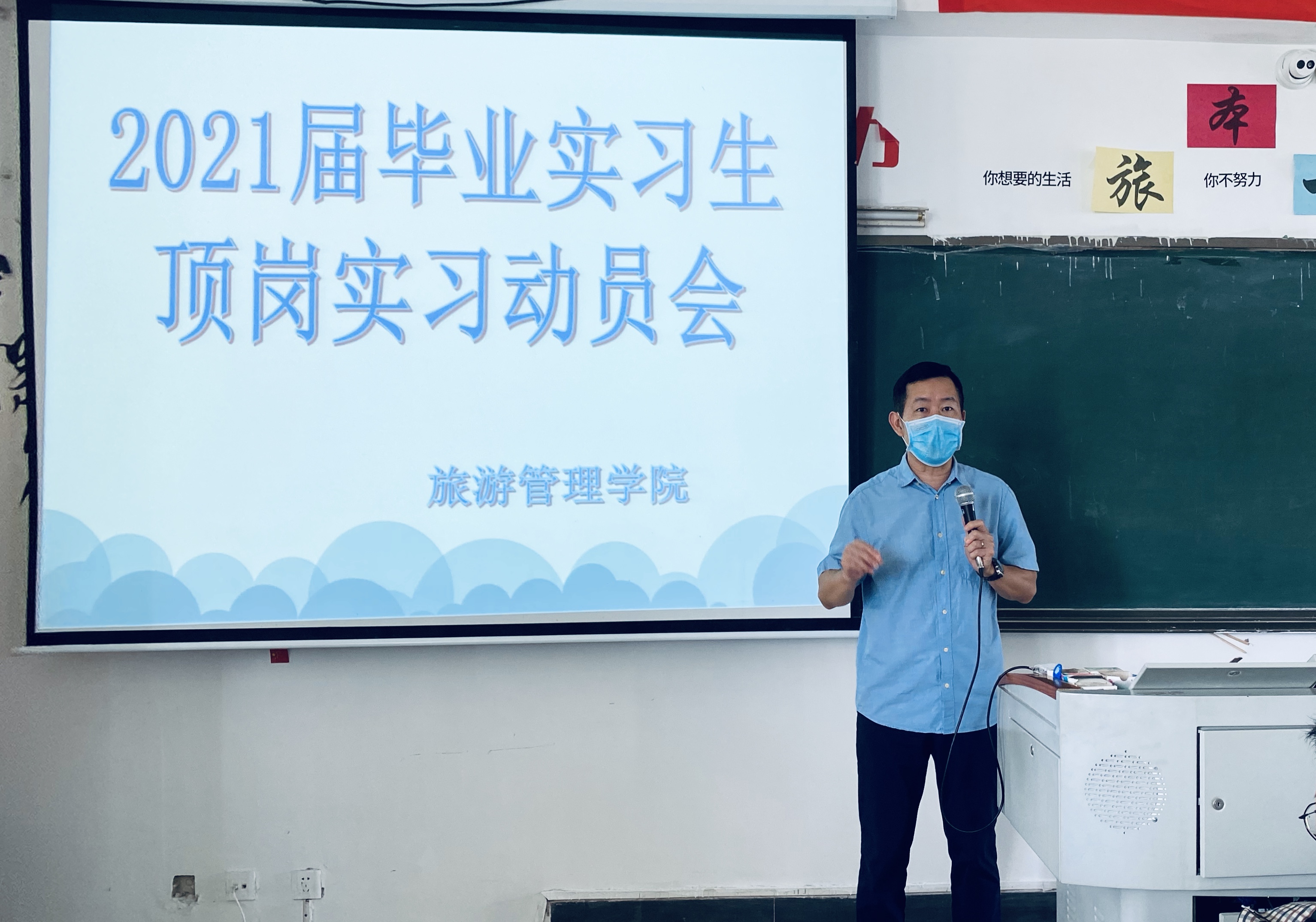 首先,旅游管理公司陈晓鹏副经理对2021届实习生做动员讲话,再次强调公司对员工实习的重视。同时对实习生的实习工作做出要求,着重强调时间观念。陈副经理向员工介绍各个实习单位的实习条件以及要求,告知同学们要珍惜实习机会,慎重选择适合自己的实习单位及岗位。