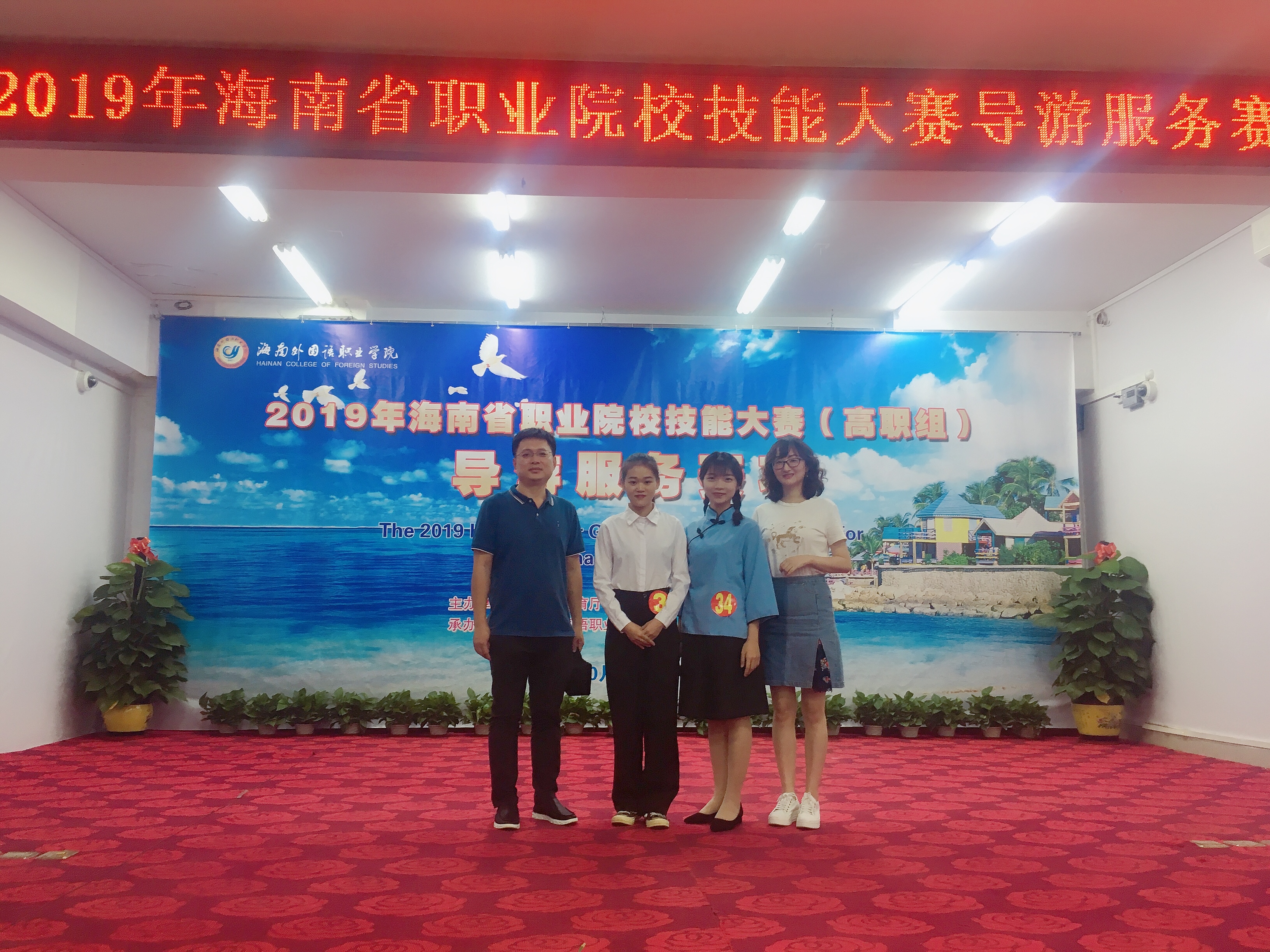 2019年10月30日下午,由海南省教育厅、海南省人力资源和社会保障厅主办,海南外国语职业公司承办的2019年海南省职业院校导游服务技能大赛(高职组)顺利落下帷幕。来自全省11个院校的35位选手参加了本次大赛。公司旅游管理公司选派18旅游管理专业2班的张喜丽、黄凤同学参赛。经过激烈的角逐,分别获得了二等奖、三等奖的好成绩。