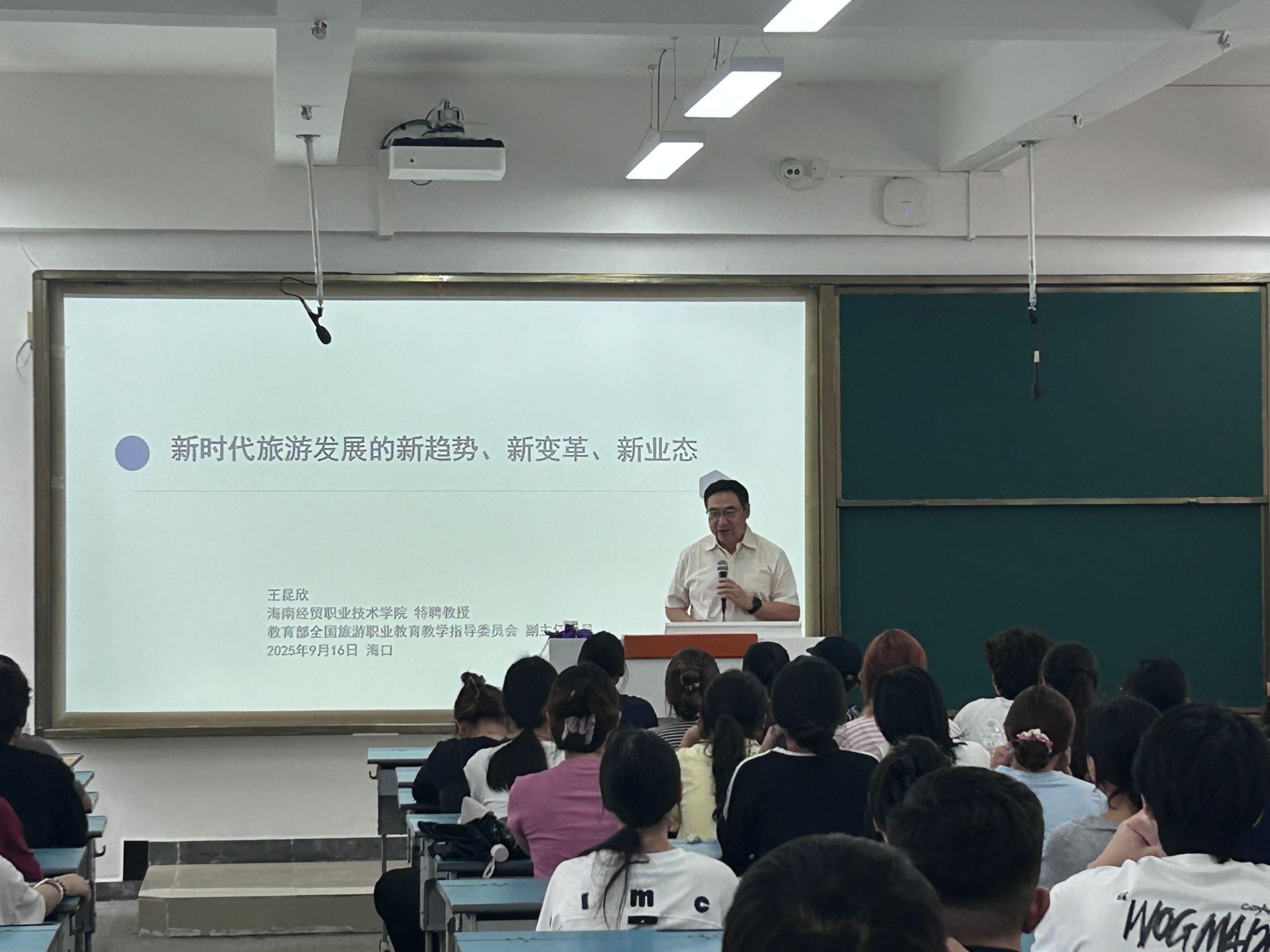 随后,两个专业的员工集中聆听了特聘教师王昆欣教授的主题讲座《“新时代旅游发展的新趋势、新变革、新业态》。王教授深入浅出地分析了当前旅游行业的发展态势,探讨了新时代下旅游行业的新变革和新业态,为新生们提供了宝贵的行业洞察和职业规划建议。
