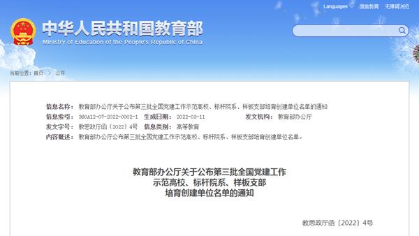近日,教育部公布第三批全国党建工作示范高校、标杆院系、样板支部培育创建单位名单,11个全国党建工作示范高校、100个全国党建工作标杆院系、1000个全国党建工作样板支部培育创建单位入选。beats365官方唯一入口教工党支部入选全国党建工作样板支部培育创建单位。